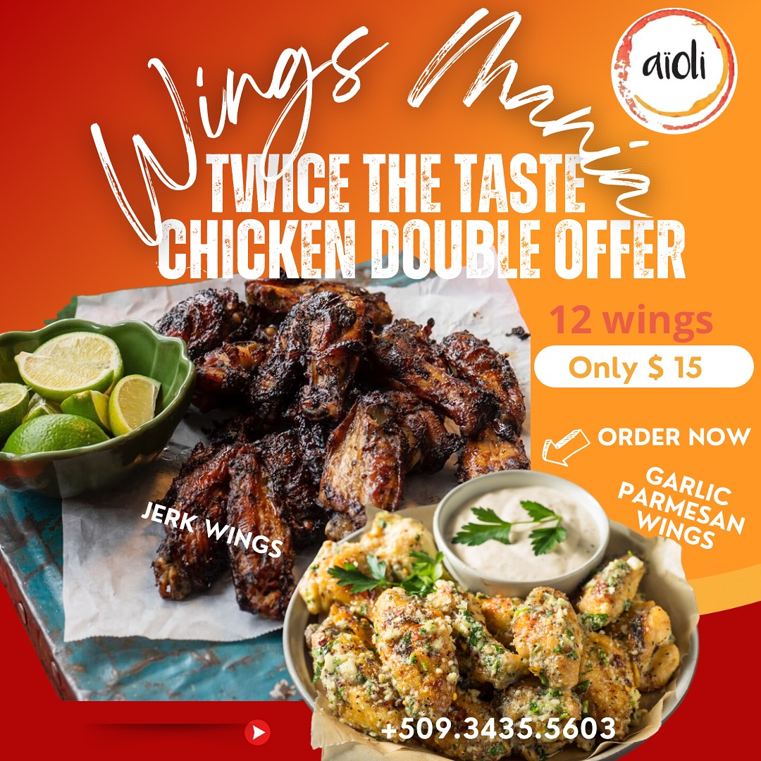 Wings Mania Thursdays is Back! @aioli_restauranthaiti Nos ailes de poulet sont parmi les meilleures du marché. Jamaïcain Jerk, BBQ, Ail Parmesan, nous avons les saveurs qui feront vibrer vos papilles gustatives ! Alors dépêchez-vous, passez votre commande car 12 ailes pour $15 partiront très vite. Appelez pour passer votre commande ou venez déjeuner, nous sommes toujours heureux de vous voir.